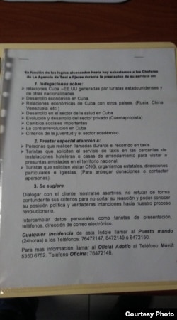 El manual del perfecto chivatón sobre ruedas pide intercambiar correos electrónicos, dirección y teléfonos con los clientes de manera que se puedan tener ubicadas a las probables piezas de los servicios de inteligencia del régimen comunista de la isla.